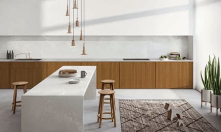 Porcelain surface 505 Archetta offers the look of natural stone recreated in an on-trend off-white ivory base impressed/imprinted with flowing grey veining. A closer look reveals muted green and crystalline yellow tones, all chicly rendered in a honed finish. The best part? The slab is suitable for indoor or outdoor use.